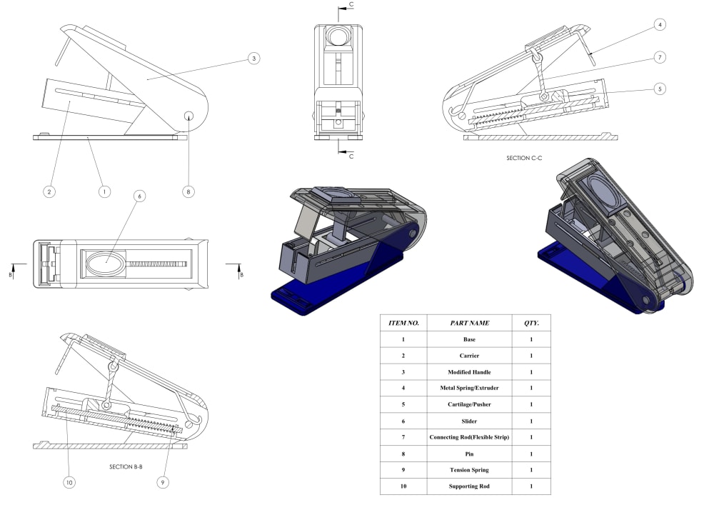 The top slider is attached to the slider of the middle portion that pushes the pins in the forward direction with the help of a spring. When the top slider is pulled back in order to make an opening, the connecting rod is also pulled back which in turn pulls the slider at the middle, leading to compression of the spring. At, this point the pins can be added and after that the slider can be simply released in order to get back to its stable position and making our stapler ready to use.