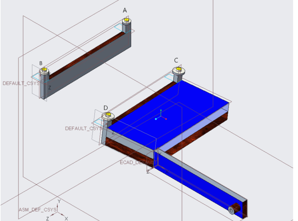 The one edge of the laptop will be placed on the suction cups A and B and the other edge of the laptop on C and D as shown in the design picture given. The blue surface as shown in the design is the space on which we can place the mouse and beneath there are two shelves in different colours.