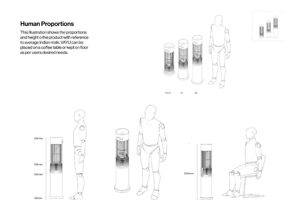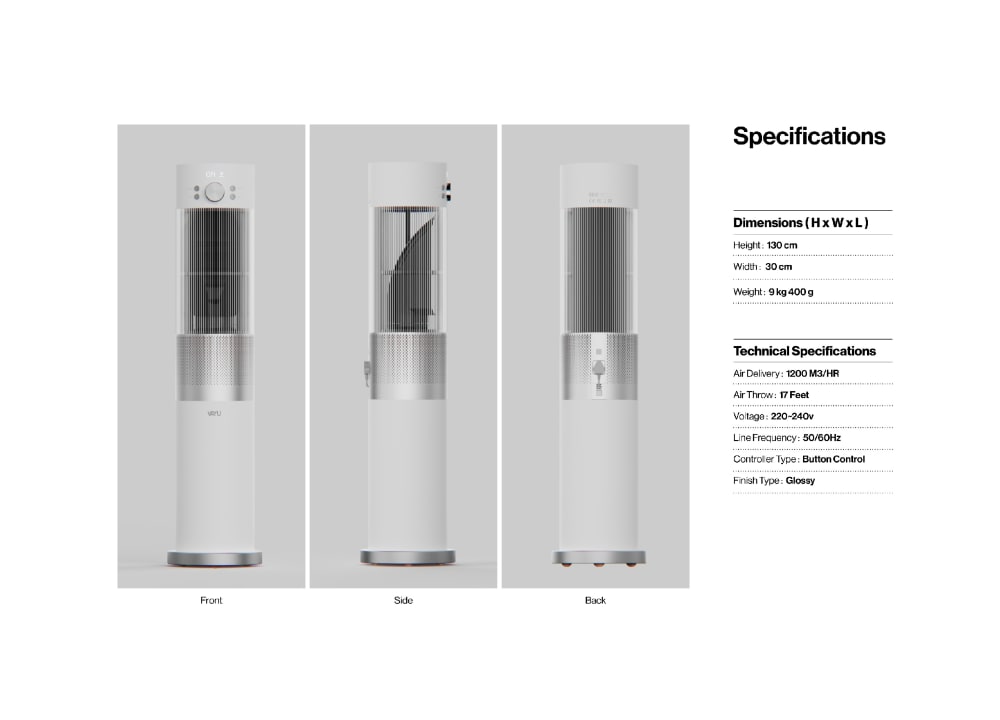 VAYU is a modern tower cooler designed for urban spaces. It has a compact monolithic form with carefully packed components which enables it to purify the air and even cools it efficiently through evaporative cooling. With its simple geometrical and subtle design language, it blends into the home decor without compromising on cooling.