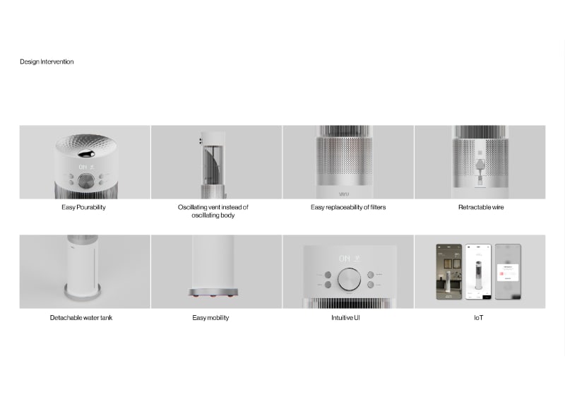 UI design: VAYU allows the user to display the output and function running currently. In addition, users can intuitively know the display of buttons such as oscillation, humidity, night mode and eco mode.