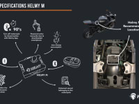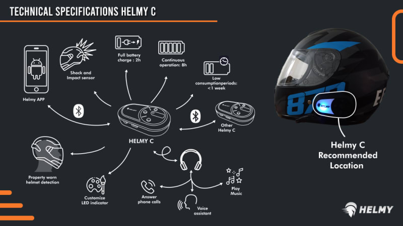 Helmy C relies on some custom electronics with collisions sensors and an intercom that allows the communication between rider and pillion. The sensors check whether the rider is wearing a helmet or not, and activates an emergency call to a registered contact number if the rider gets into an accident.