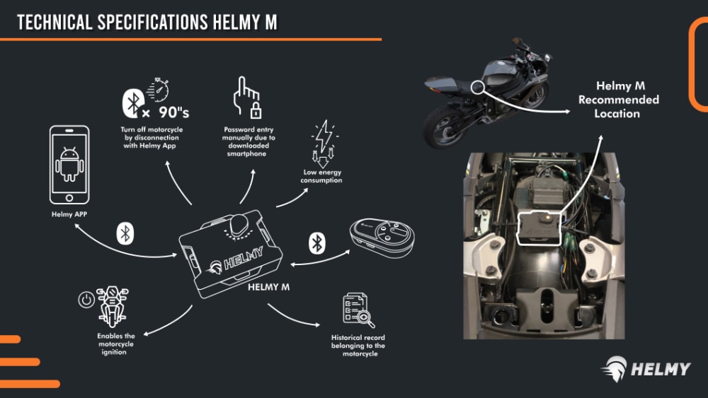 Helmy M has two functions: First, it prevents the ignition of the motorbike if the rider is not wearing a helmet and second, it protects against robbery. The motorbike starts only if Helmy M is paired to the Helmy app and both are within 3 m of distance. If not, the motorbike turns off after 90 seconds and the app sets an alarm that can only be heard through Helmy C. In addition, the system includes a key fob that could be set up once the system is installed and you have to type in the Helmy app every time you start the motorbike. Only, If the master code security matches the one in the app and the motorbike can roll. It is also possible to disconnect the security functionality if the app is not active and therefore to use the motorbike without the security option.
