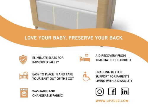 Upzeez is an innovative crib that challenges the existing baby products in the market. Our smart 3 in 1 High-Rize Baby Crib is a market disruptor and caters to a wider target audience that struggles with the conventional cribs. This includes women that have had a traumatic childbirth as well as those parents with disabilities.