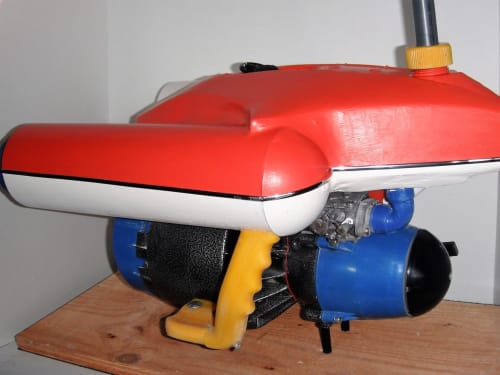 What I’m about to describe is like a gold mine that has caved in. It’s actually my original patented Aquascooter, a 15 lb miniature gas powered PWC that can pull you through the water in a swimming position, like James Bond, at a surprising rate of speed. It has the power to keep up with Dolphins.