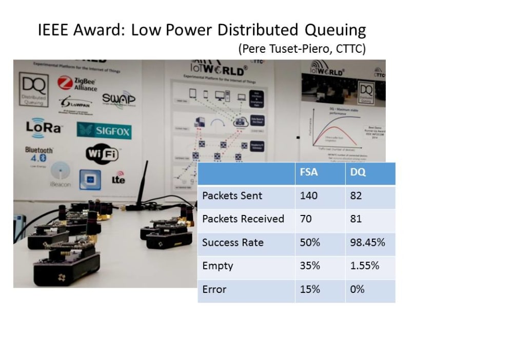 Distributed Queuing (DQ) was originally invented for cable TV broadcasting. However, the first two demonstrations have been on long rang IoT radios such as LoRa and Zigbee. In both demos, packet efficiency rose from a maximum achievable 50% under Aloha, to 98% when DQ swapped with Aloha. The physical radio also performs better when it does not need to contend with the bottleneck at the bottom of OSI layer 2, which results in an effective doubling in throughput packet efficiency. In fact, DQ completely eliminates the need to retransmit payload data over and over, which today accounts for half of the bandwidth usage in busy shared wireless data networks prone to collisions and retransmissions.