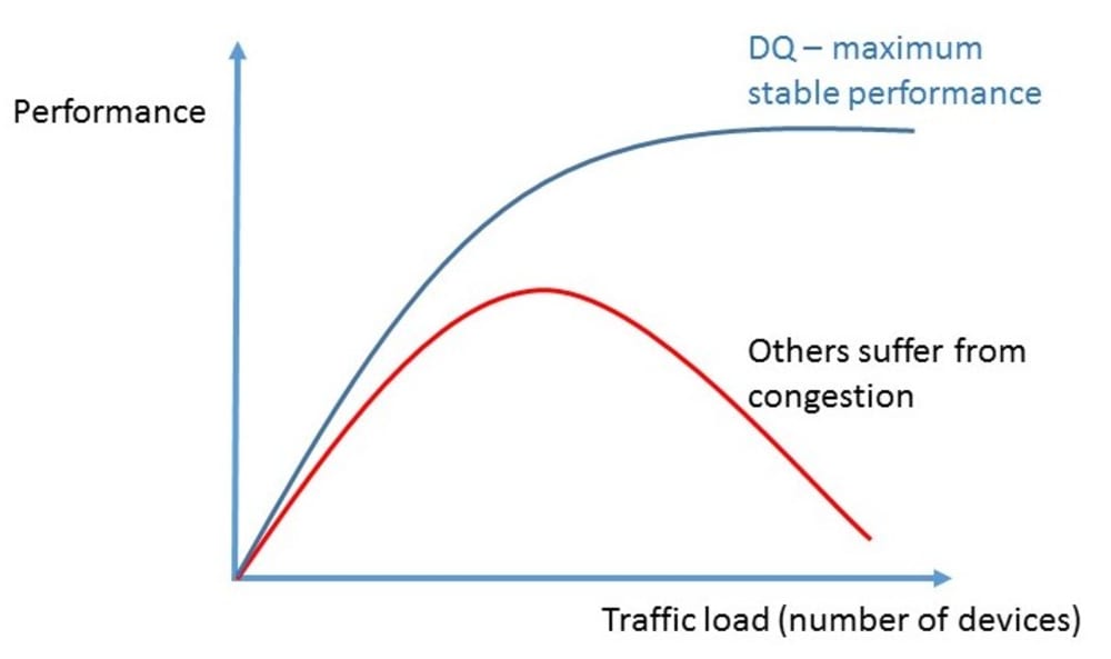 Buddenberg at the US Post Graduate Naval Institute commented that DQ would have awesome properties for RF anti-jamming since it could shift the master terminal or cluster head operation on the fly. GM liked DQ for encrypting the entire packet including the header, and of course, that DQ would not starve low priority data as a CAN replacement in vehicles for which it was published in the SAE Journal.