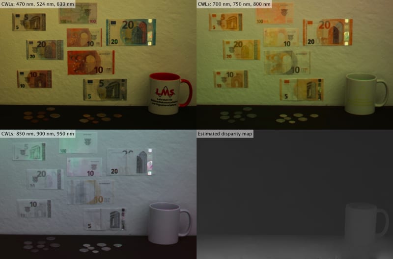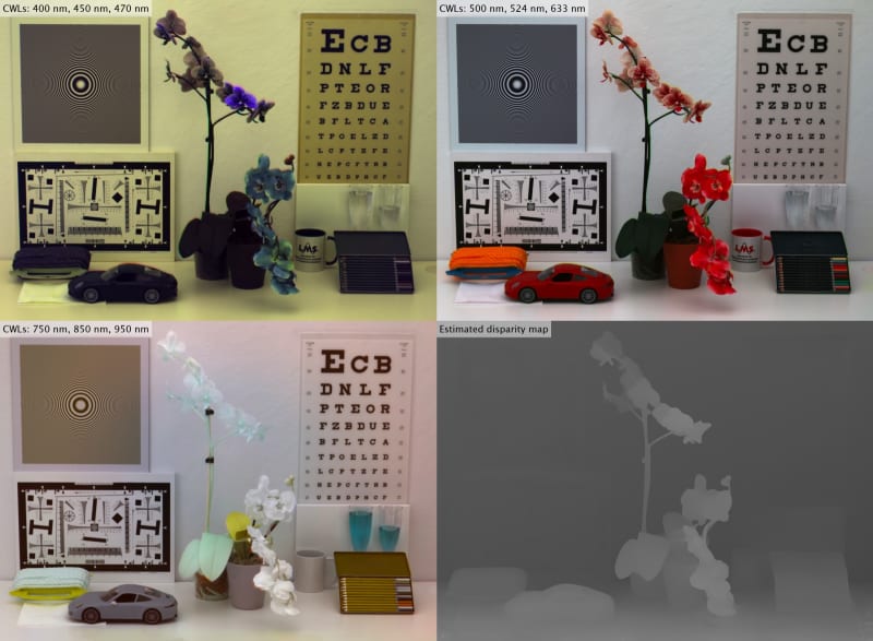 Furthermore, the use of standard components allows for an ultimate flexibility, that is to say, spatial, temporal and spectral resolution only depend on the type and number of used cameras. At the same time, the elimination of special hardware allows for a compact design and employment, e.g., in mobile devices or drones, while being very cost-effective. Moreover, the CAMSI system implicitly generates depth information for the captured scene. This information, e.g., can be used for multi-spectral measurement tasks or 3D imaging applications.