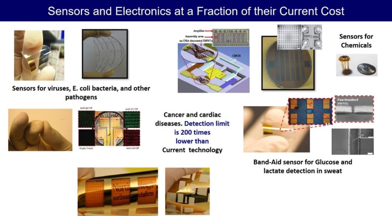 Our directed assembly-based nanoscale manufacturing platform is revolutionary new nano and microscale electronics manufacturing system. It utilizes basic physics and physical chemistry to direct the assembly of nanoscale particles or other nanomaterials in suspensions in a room-temperature, atmospheric pressure onto a substrate precisely to print electronic devices. The technology is a radical departure from conventional semiconductor manufacturing techniques which require thousands of process steps comprising of high energy deposition processes followed by aggressive chemistry for etching. Using the Nanoscale Manufacturing Platform, multiple material layers of the same or different material can be printed on previously printed structures by repeating the directed assembly process. The technology enables the creation of 0D, 1D, 2D, and 3D structures with the desired combination of materials down to nano-scale structures (demonstrated to 20 nm structures). All at a fraction of the cost of conventional fabrication equipment. The Nano OPS manufacturing platform has been proven for its effectiveness at wafer-scale manufacturing and currently producing devices on the 4" (100mm) wafers.