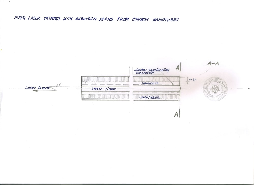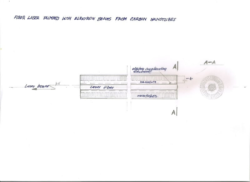 The laser shown in the drawing is made of a tubular outer electrode with high-quality surfaces of carbon nanotubes on the inner surface. Below is an electrode that accelerates the electrons. The cylindrical electrodes with nanotubes surround the laser rod and the whole is placed in a housing with a vacuum.