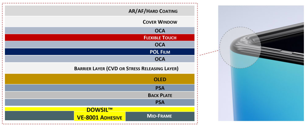 DOWSIL™ VE-8001 Flexible Silicone Adhesive, a two-part solution for flexible display applications in foldable and rollable consumer devices, provides high-stress neutral line and good elongation for the small folding radius in electronic displays. It is based on thermal curing (80°C for 30 minutes at 300 um thickness) and provides stable mechanical properties after repeated dynamic and static folding for foldable and rollable display devices.