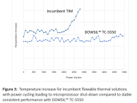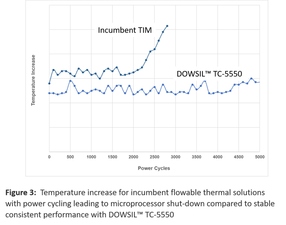 Feasibility: Newer microprocessors without integrated heat sinks require thermal solutions to break the paradigm of choice between high performance and high reliability. Higher warpage in these packages results in complete pump-out of traditional TIMs around die periphery, in effect removing the TIM from its needed location. The adverse impact on microprocessor performance is debilitating. In contrast, TC-5550 remains in place and with continued outstanding performance. Major customer trials have validated its ease of application, performance and robustness to survive warpage for 5000+ thermal cycles lifetimes. DOWSIL™ TC-5550 enables better microprocessor performance to “create the future” of high-performance computing.