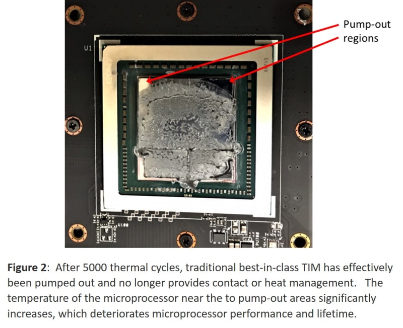 Marketability: TIMs in demanding microprocessor applications are designed to have flowability for printing and ease-of-application/assembly. The rheological properties allow thin ~20µm bondline thickness (BLT) by squeezing during assembly. But the flowability at thin BLTs inevitably compromises reliability with temperature cycling reducing device reliability. Newer high-power microprocessors with larger die size, 2.5 and 3D stacking and space-saving designs to remove integrated heat spreaders are becoming prevalent. The challenge with these technology advancements is significantly more dynamic die warpage with power cycling. The warpage ranging from 50-100µm much larger than the BLT severely stresses TIM stability. An alternative is solid (flexible graphite) films but these cannot form the intimate substrate contact for thermal transfer, throttling initial performance.