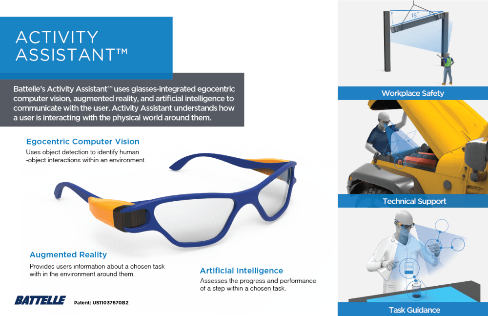 Imagine becoming an expert at activities you have never performed before by simply putting on a pair of glasses. Well, Battelle’s Activity Assistant™ does just that. Using glasses-integrated egocentric computer vision, augmented reality, and artificial intelligence, Activity Assistant understands how a user is interacting with the physical world around them and guides them through a series of steps to complete an activity, such as fixing a car engine or conducting a chemistry protocol. Activity Assistant knows if a user makes a mistake and provides corrective visual and auditory feedback as well as tracks performance. This augmented reality-based assistant provides a revolutionary modality to present relevant perceptual details alongside real-world information to direct user attention and improve user performance while limiting cognitive load.