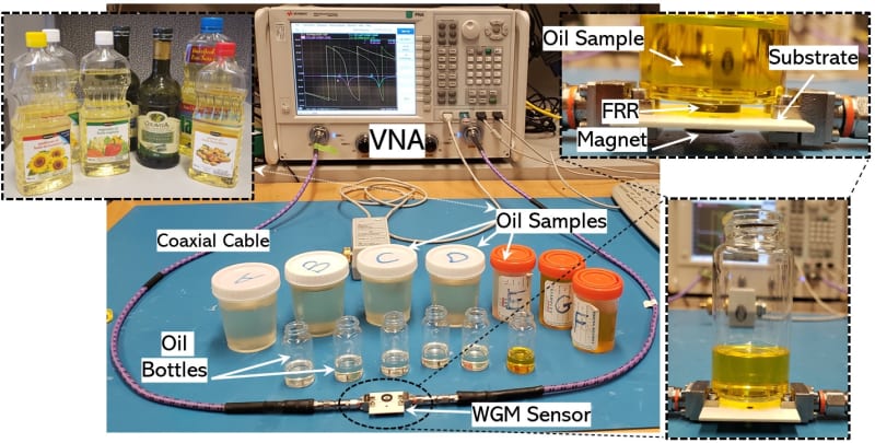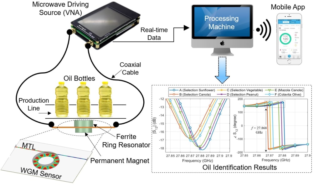Towards implementing a smart IoT monitoring system that impedes the frequent fraudulent practices, a low-resource microwave sensor of small size (~ 6 cm3) and high sensitivity is developed for rapid non-destructive detection of oil types, brands, and/or quality without having to open any bottles off-shelf. The Whispering-Gallery-Mode (WGM) technique is used to implement the sensing platform in the millimeter-wave range 22 – 32 GHz where the microwave power from a microstrip-line is coupled into a ring resonator made of ferrite material of high resistivity and low-loss. Its magnetic anisotropy is exploited to engender a non-reciprocal effect on the induced modal fields in the presence of a bias magnetic field. The acquired nonreciprocity feature would allow for checking the oil products, when placed nearby the sensor, at multiple instances of highly sensitive WGM modes at distinct frequencies in both S12 and S21 transmission signals. Illustration 1 depicts the sensor implementation at one hot spot a few millimeters underneath the production line where all oil bottles pass through. The interaction of the sensor E-field with the oil material on top of the ring resonator, allows for recording its scattering response in few seconds by the connected Vector Network Analyzer (VNA), analyzing, and comparing it against a reference response using an AI-based software running in the attached processing machine to report any differences in quality between oil products. Measured scattering results on a fabricated prototype (illustration 2) have demonstrated its detection functionality with significant changes in resonance frequencies, phases, and dips of the induced WGM modes when testing various edible oils.