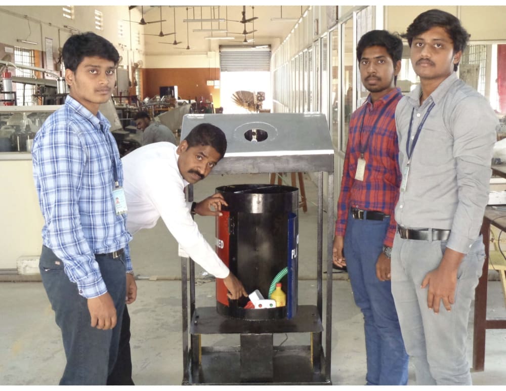 In this fabricated system, waste is pushed through a flap into the proposed system. An IR proximity sensor detects this and starts the entire system. Waste then falls on the metal detection system. This system is used to detect metallic waste. After this the object falls into the capacitive sensing module. This module distinguishes between wet and dry waste. After the identification of waste, a circular base which holds containers for dry, wet and metallic waste is rotated. The collapsible flap is lowered once the container corresponding to the type of garbage positioned under it. The waste falls into the container and the flap is raised. The waste in the containers now can be collected separately and sent for further processing. This project helps us a lot in resolving the issue of complex waste segregation by making the entire process automated. It also reduces the occupational hazard & human effort of the workers involved in the waste removal process, simultaneously achieving a healthy & waste ridden environment.