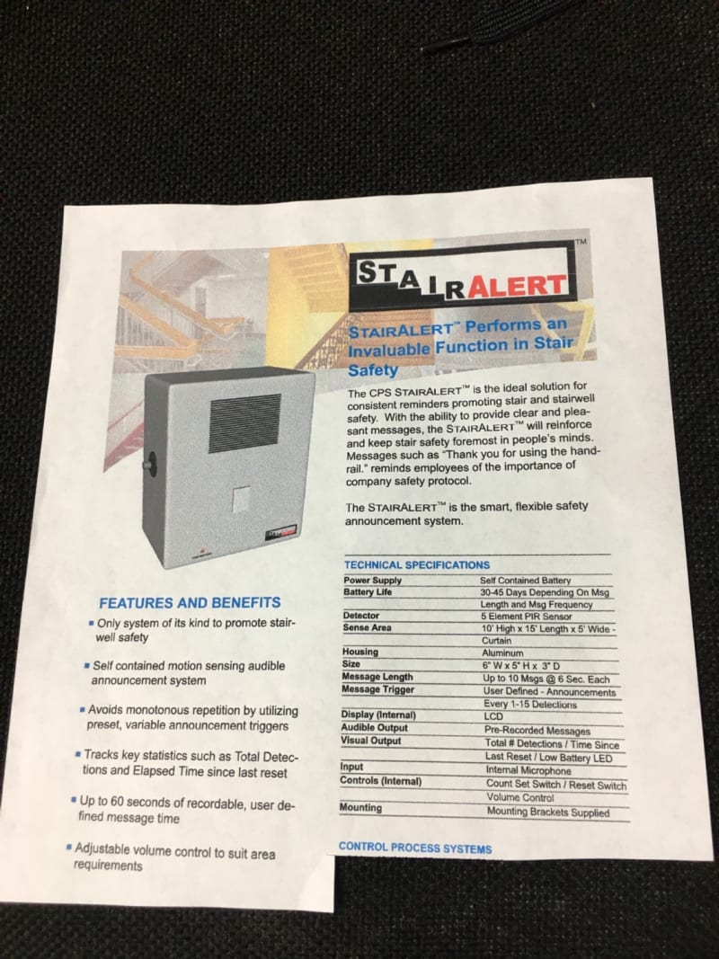 This device will issue an audible message when people are ascending stairs. Its purpose is to alert people to the safety of using the hand rail and watching their steps when going up or down stairs. There are thousands of accidents on stairs in the US every year. By using a reminder this will help cut down unnecessary accidents on stairwells. It can be set up to say please use the handrail, or please watch your step. Multiple messages can be sequenced so people don't hear the same one every time. The brochure describes operation and options for the unit.