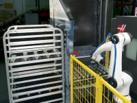 The automated material loading system can be applied to many types of applications on the factory floor, including pick and place, packaging, inspection, and welding. Additionally, this technology can be appropriate for machine tending applications such as CNC Mills, CNC lathes, and grinding/surface finishing.