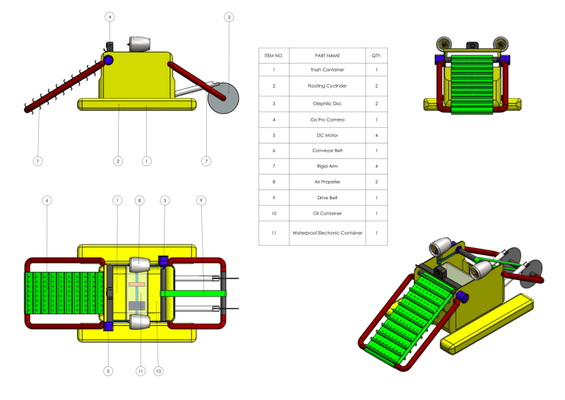 - It consists of metal teeth-based jaws that are attached to the conveyor belt mechanism. These claws help to pick up the waste from water.