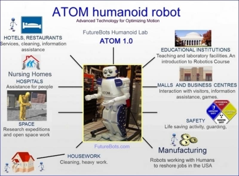 The ATOM 1.0 humanoid project is advancing robotics to support the needs in many fields and will solve many dangerous jobs humans need not do any more.