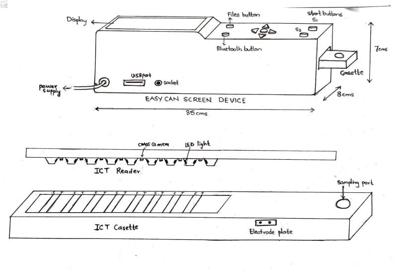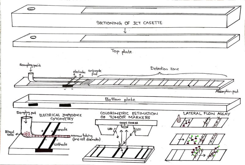 Machine will have 2 units in series, hemogram unit for counting WBC via microfluidic electrical impedance method and a lateral flow reader for immunochromatographic analysis of the cancer antigens to be quantified by it, equipped with LED light and CSOM camera to detect the same.