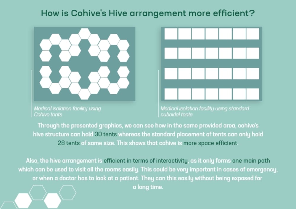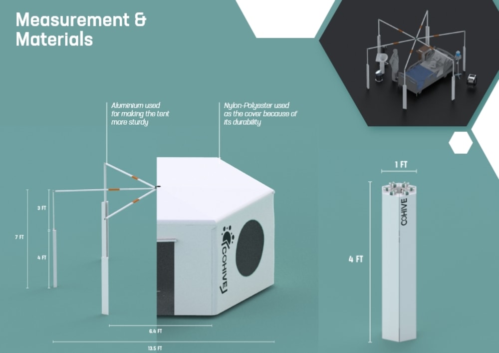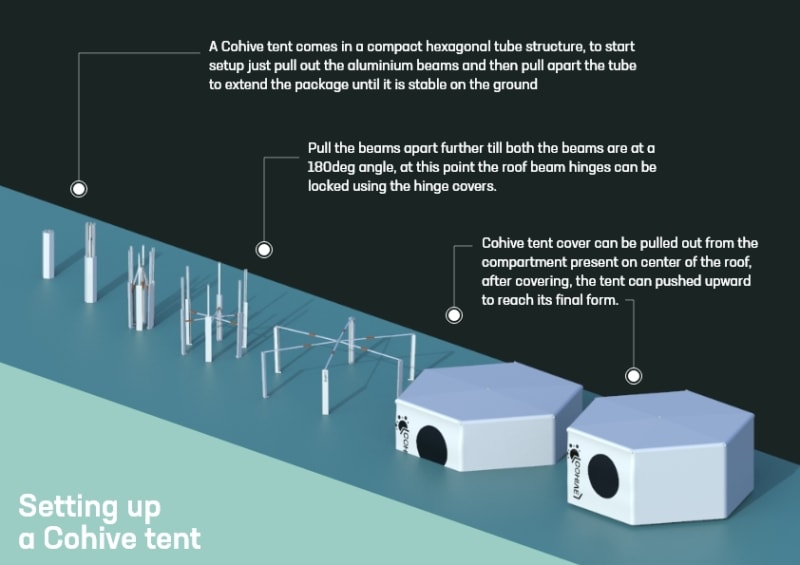 Cohive is a modular tent that comes in a very compact package but can be easily set up to create a large tent which can be used for various purposes. For instance it can be of great use for creating a portable isolation facility solution, in the current situation of the coronavirus pandemic. The Cohive tent when in its enlarged farm, takes the shape of a hexagon, which can be grouped with other tents to create a hive based system which is both space-efficient & easily manageable.