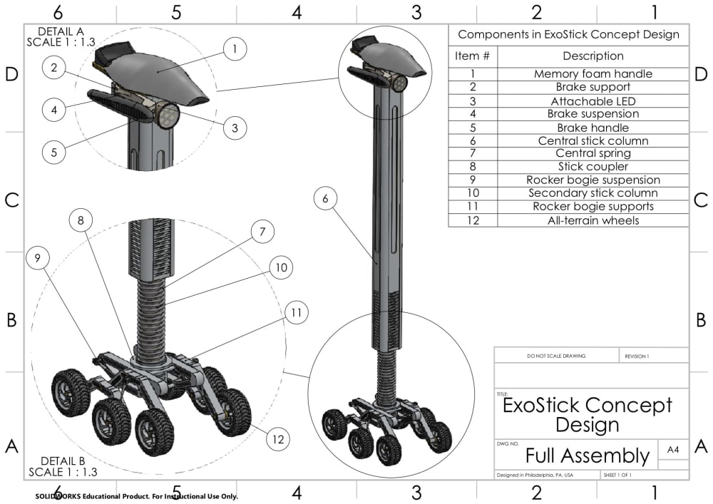 Designed to restructure the basic concept of conventional walking sticks, ExoStick offers ergonomic, pressure sensitive, and highly mobile capabilities, all while addressing the two key aforementioned problems: grip and pressure. On its top, ExoStick’s hand platform incorporates memory foam, a large surface area, and a comfortable padding that distributes stress and molds to the user’s hand, allowing for a natural position. On the bottom, ExoStick’s multiple shock absorbers and its Mars rover-inspired rocker-bogie suspension system with all terrain wheels minimize the strain and vibrations that stem from the impact of lifting and setting down a walking stick in the ground.