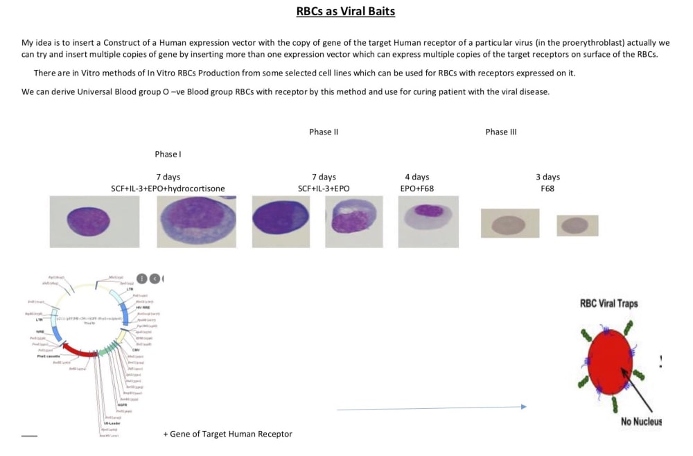 For viral infection, we can make more than one viral receptors on RBC by inserting genes of that receptor in human expression vector in the hematopoietic cell lines of universal donor cell lines like cell lines of O+ve and O-ve group and making blood from that cell lines and then circulating that blood in throughout the body as the viral baits and can reduce the heavy viral loads by blood transfusion in the body if there is any factor such as proteases produce by virus to lyse the RBCs we can try mutant of the protease target on the surface of RBCs so that RBC is in tact and functions well.