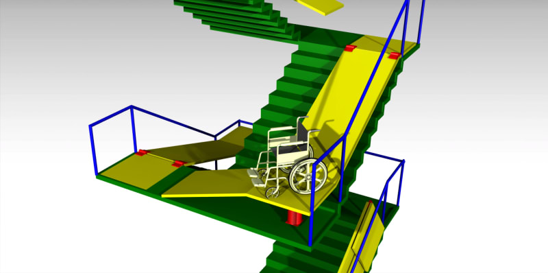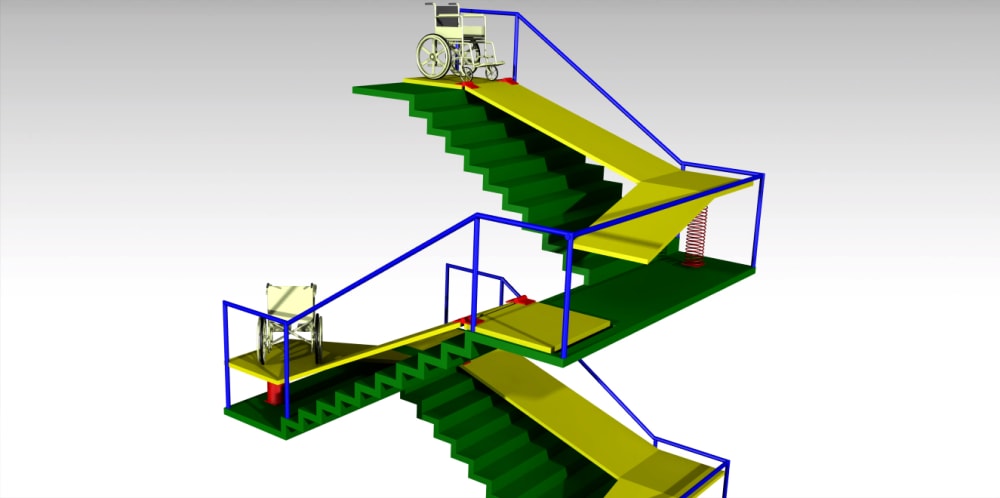 This project is about building a new kind of building stairs that is very accessible for wheelchair users to evacuate the premises in case of emergency. This is done by combining a ramp with a spring system to continuously adjust the slope of the stairs. The main impossible challenge of building a ramp in building stairs is that the slope will be too high and adjusting to the right angle will not be possible because of distance limitation. But this simple mechanism will solve this problem by using a mass spring system to adjust the slope of the ramp at all times. Meaning, the maximum slope for a ramp is 18 degrees which this mechanism has and a person with a wheelchair will go down in case of emergency without any problem or a need of additional evacuation equipment by themselves. As the wheelchair user reaches the end of the 18 degree slope he/she will be at the top of a mass spring that compresses when a load F is applied on it with lower velocity V. This will enable them to reach the final tread of the stair completing the floor riser. As they step off the ramp, the spring will stretch attaining its original height for others to do the same task. All the wheelchair users have to do it repeat the same process until the ground level, evacuating without any help of any kind. The ramps can also be used by all people including physically fit people and all kinds of physically disabled people because in case of emergencies running on the stairs is a bit dangerous if one is not careful and slope grounds are better than stairs when traveling at a fast pace. When the ramp is not being used for an emergency it can be attached to the hand rail of the stairs.