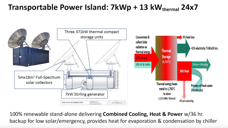 The lower temperature allows less energy for condensing. We use an absorption chiller, one with no moving parts and powered from the solar thermal power unit's heat.