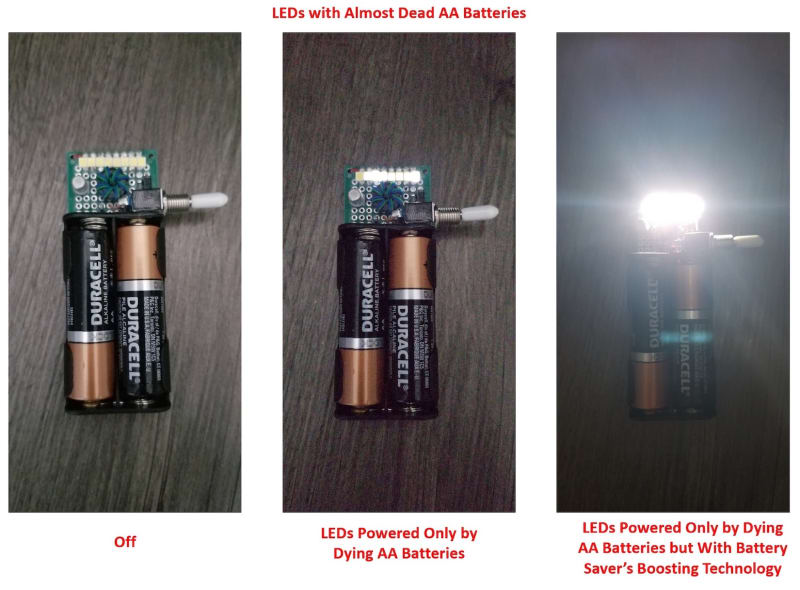 A patented device that attaches to any battery or device and results in utilizing all of the power left in a dead battery. We have proven prototypes for flashlights to smoke detectors to medical devices. It has the ability to dramatically lower the waste accumulated from dead batteries. It is very inexpensive, costing pennies and can be adapted for cell phones and any device using a battery or batteries. It has the ability to utilize the approximately 20% of life left in "dead batteries" which results in cost savings to individuals, corporations, military, etc.