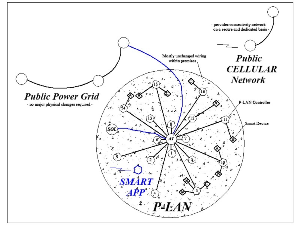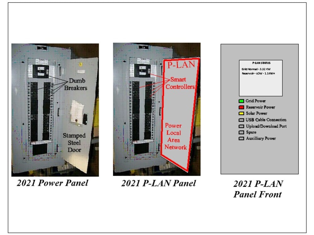 Our innovation is The P-LAN that provides a better electric power system that supports the major contemporary and future enhancements. P-LAN stands for Power Local Area Network and it converts our dumb distribution system into smart and flexible at lowest cost. P-LAN uses Artificial Intelligence contained within a “smart” panel door that replaces the stamped steel door on virtually every power panel installed within premise wiring systems. No wiring changes, no new codes and no additional skill sets are required. The attached sketch illustrates this conversion. Little to no alteration of the public power grid is required because P-LAN uses mostly the existing on-premise system to effect change.
