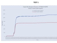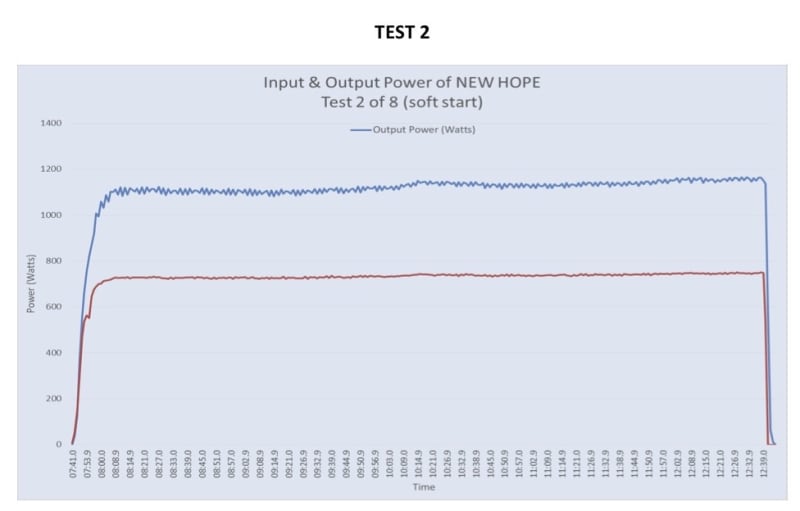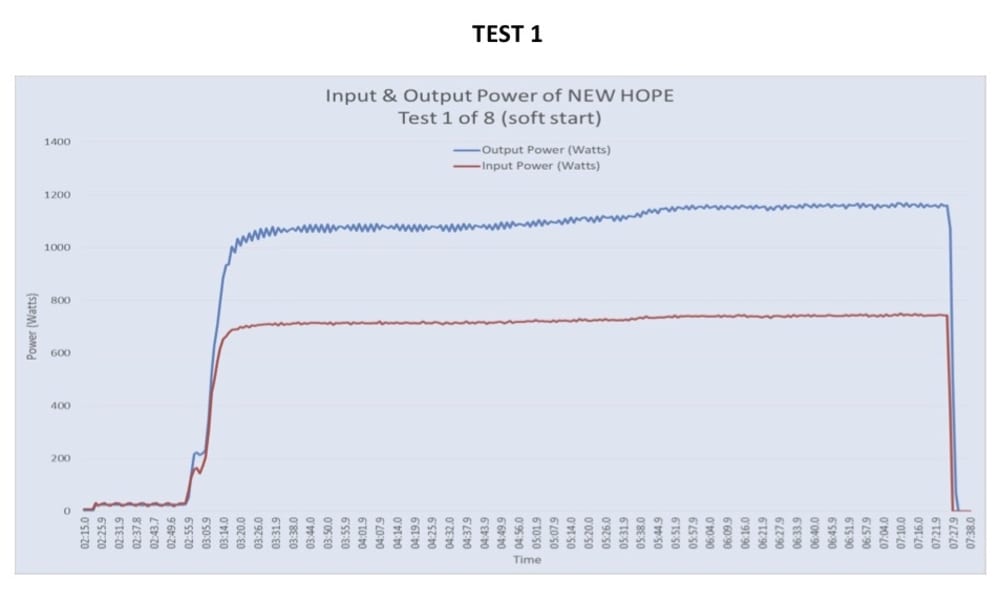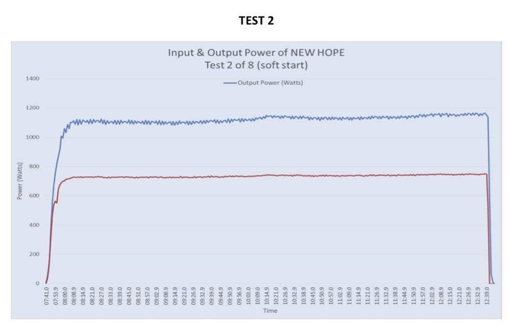 Test 1 - How and why New HOPE achieves efficiencies that are inconceivable for science and scientists, physics in particular. New HOPE is NOT violating the laws of physics, because some elements of the energy available and harnessed are not mentioned or included in the equations. The rotating mass is initiated with an electrical input, causing changes in and around the conditions of the oscillating disc, resulting in a downward slope, permitting the mass to accelerate under the influence of gravity and momentum. Once the inertia within New HOPE is overcome, the momentum of the rotating mass continues to generate drag greater than the input; compelling evidence of the above mentioned is highlighted in the measurements taken with a calibrated Zes Zimmer precision power analyzer. The most accurate/precision power analyzer we witnessed amongst ten other analyzers.