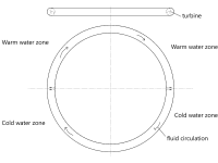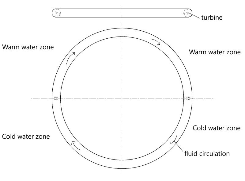 The hollow doughnut structure is made from the best heat exchange material like copper and have two lightweight turbines installed inside of it. The main purpose of the two turbines is to circulate the fluid or water inside the doughnut structure. The circulating water will lose and gain thermal energy when passing the two locations or zones which are the hot water zone and cold water zone stabilizing the heat difference between the two locations.