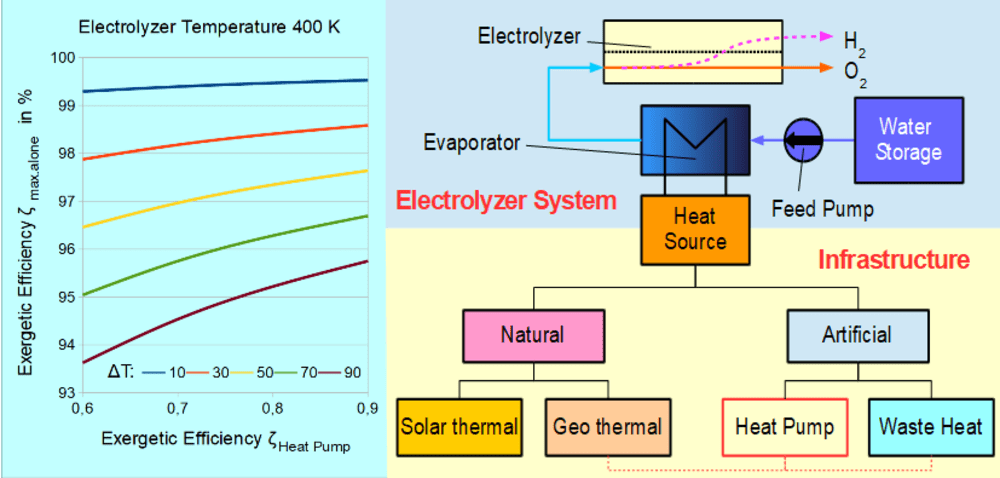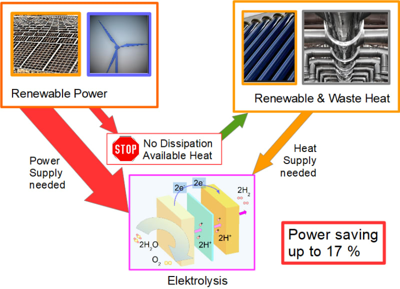 Leading to the following improvements. Starting point is controlling the energy flows in electrolyzers following the thermodynamics of the reaction and thus covering the heat demand by waste heat management instead of electric power. The electricity savings potential is 17%. Thus theoretically, 100% of the electric work can be stored as thermodynamic potential. Therefore practically occurring losses are only due to the technical implementation (e.g. temperature differences, pressure losses etc.). The application of these findings leads to the following innovative designs summarized as E-Hy BOX and its associated processes.