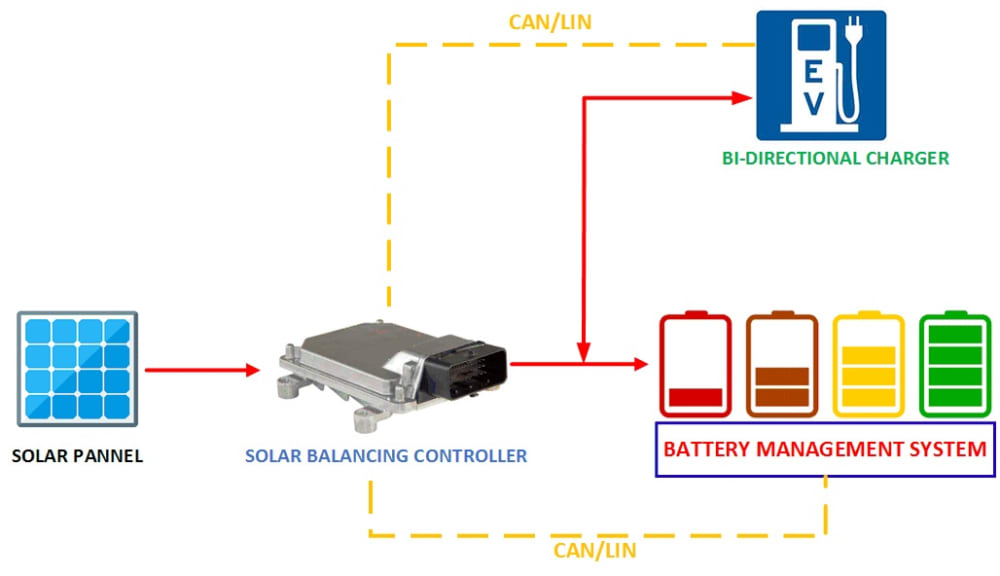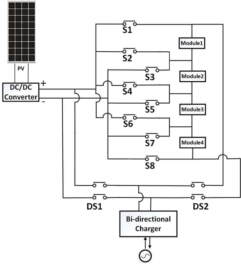 Li-ion battery systems are widely used in electrified vehicles. The imbalance of state-of-charge (SOC) between battery modules/cells will bring detrimental effects to the battery. The conventional balancing schemes equalize battery by discharging high SOC cells. They waste useful energy and are not widely applied to balance battery modules. On the other hand, solar technologies are blooming as a solution to global climate change. However, it is not widely used in vehicles due to its low cost-performance ratio.