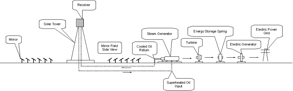 A solar-thermal dish, instead of the solar tower depicted here, captures and transfers thermal energy to a steam generator that powers an electric generator that provides the electricity necessary to electrolyze ocean water.