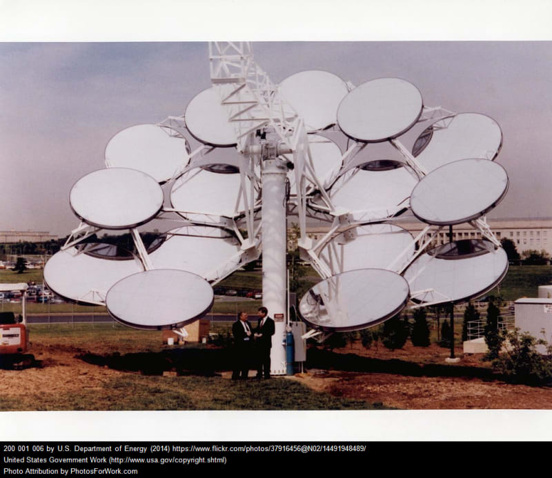 Instead of the fixed dishes shown here, a portable twelve foot solar-thermal dish that tracks the sun can be mounted on a trailer and moved if / when necessary.