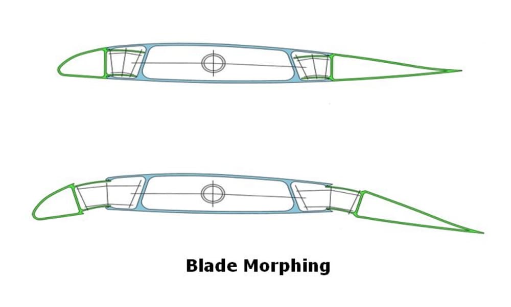 The morphing will be controlled by the existing turbines pitch control system. Morphing technology will improve the force applied giving more sustained and greater rotation speeds in low winds. This will be accomplished with the more efficient blade profile that includes morphing.