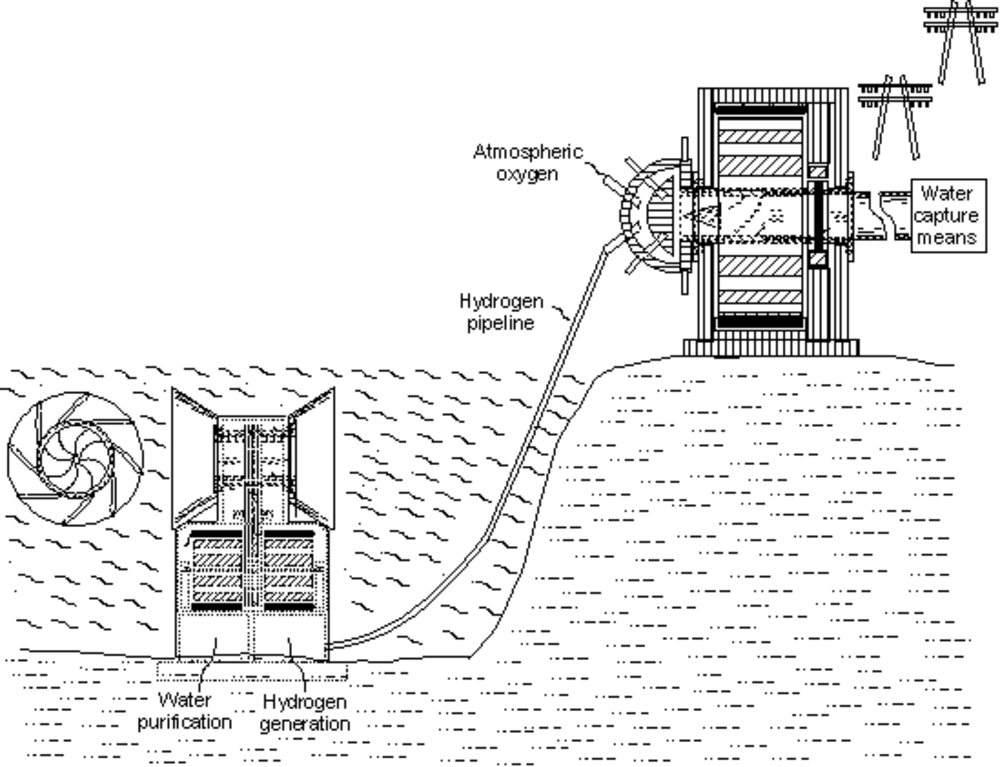 Once a national hydrogen pipeline is in place, existing power plants that utilize fossil or nuclear fuels will benefit by converting to Hydrogen-Fired Hollow Generators.™ These generators combine atmospheric oxygen and hydrogen in a combustion chamber to produce heat, thrust, and water vapor. Water recovery apparatus (such as those used for distillation), heat exchangers, and turbines (with attached electric generators) collectively produce electricity and potable water for distribution to homes and businesses.