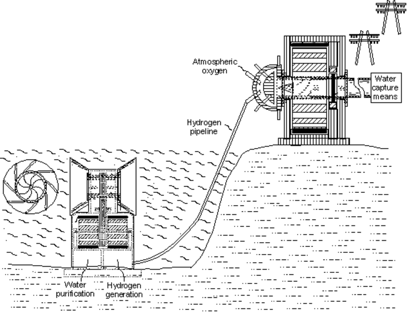 Hydrogen, via the electrolysis of ocean water, effectively stores the energy that was captured by the turbines pictured here. If electrolysis requires more electricity than is generated on-site, electricity from other renewable sources and/or the national power grid may be utilized.