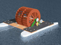A water wheel can be scaled up or down. The surface speed of rivers varies between about 3-8 MPH. Floating water wheels are typically 25-45% efficient, however the pontoons shown are shaped like airfoils to increase the speed of the water between the pontoons under the wheel to increase the efficiency.