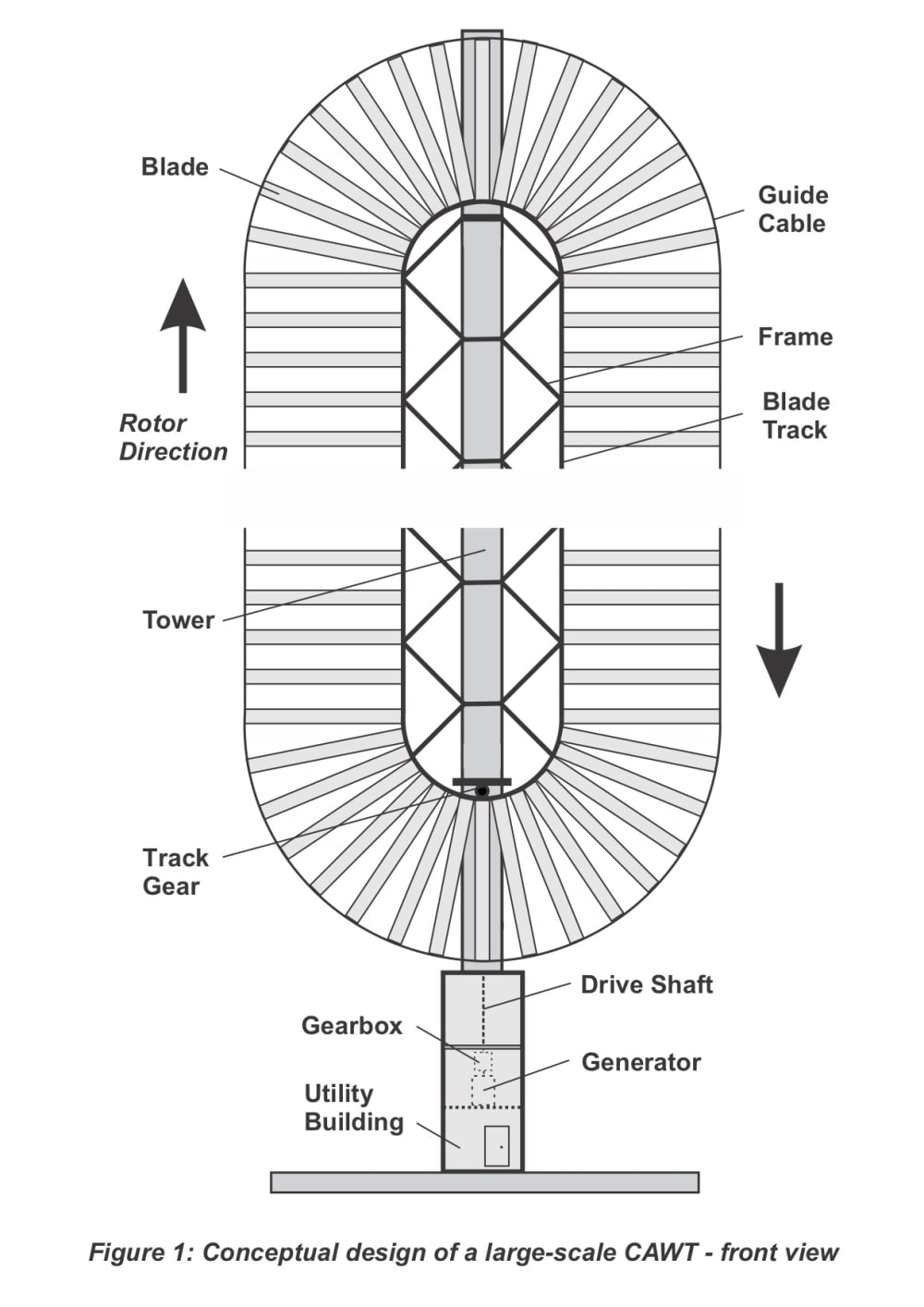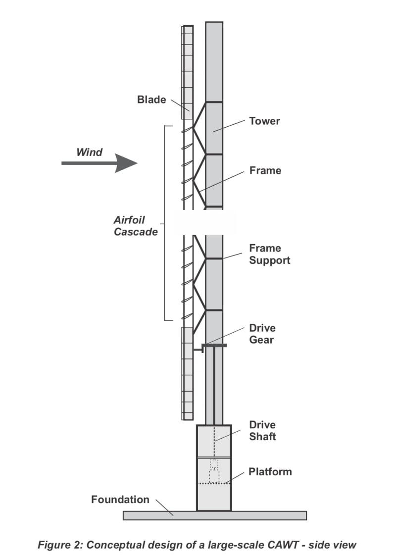 - the CAWT tower is less massive and is cheaper to build than a HAWT tower, because it does not support a heavy nacelle.
