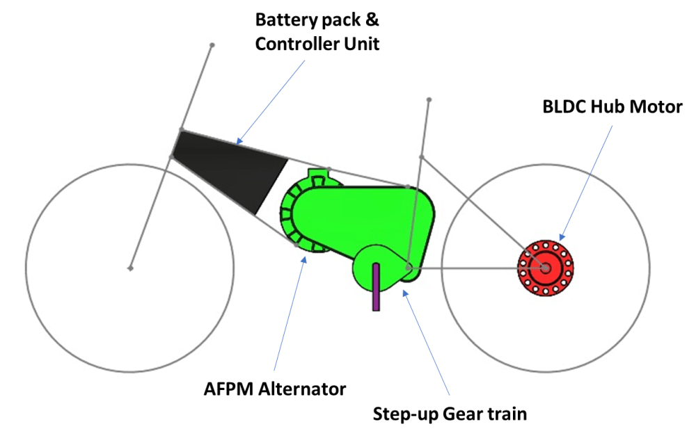 A typical electric bike ranging 60KM per full charge will take more than 3 hours to charge and limited availability of public space makes it difficult to install charging stations. In this model, a powertrain is proposed for an electric bike which has its own power generation system.