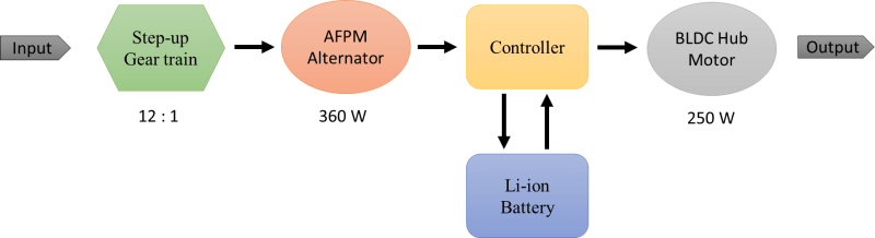 The crossbreed power train can able to produce 360W of electrical power from 52W of input mechanical power at pedal with max. speed & torque of 30 rpm and 16.5 N-m respectively. It could operate a 250W BLDC hub motor with max. speed & torque of 400 rpm and 32 N-m respectively. The relation between various segments of the proposed powertrain as represented in illustration #2.