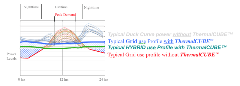 Each linkable CUBE permanently shifts and stores 77.5kW of harvested / converted electrical energy as 22 tons of phase-changed Thermal Energy as (ICE) for cooling/air conditioning for up to 96 hours storage (without degradation), available on-demand for comfort and health-maintenance cooling.