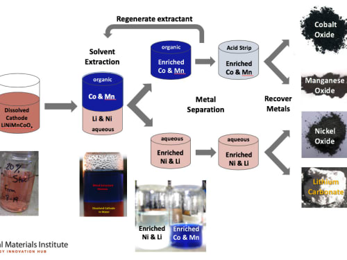 This process is an electrochemical process that effectively leaches cobalt and other valuable constituents from Li-ion battery electrodes. A reductant is used to solubilize the metal species in a dilute acid solution. Typical recycling process reactions usually require elevated temperatures and multiple hours for completion. INL’s process helps lower the cost of the recycling process.
