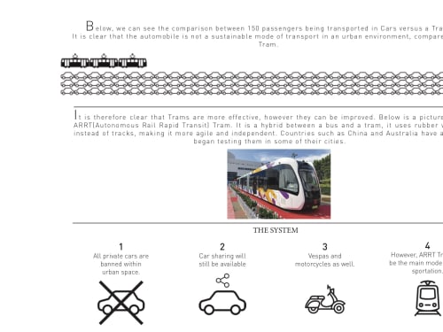 Today's current urban transportation system is full of problems. Traffic, parking, pollution and accidents are some of the main ones. From a designers perspective, our current system is not efficient and sustainable. Therefore I had the idea to design an urban transportation system, making it as sustainable and efficient as possible.