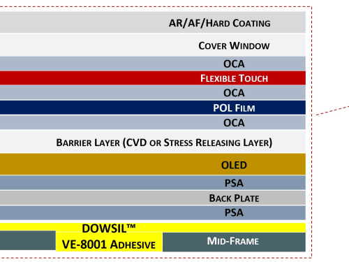 The latest foldable display provides a larger screen in less space for a more vivid immersion experience. In these devices, non-metallic materials such as organic foam films (polyurethane, polyether) or high filler-loaded silicone rubber are applied around the metal hinge frame and in other important areas to prevent cracking in the bendable area. However,