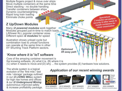 Shipping transport changed to containers some decades ago but that created another transport bottleneck, the port crane, that can usually move about 200 containers per hour. Our 1000 containers per hour port crane system uses around 200 x,y,z movement crane modules, battery or green hydrogen powered, to pickup containers,