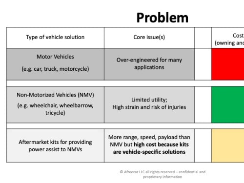 A briefcase-sized e-kit (comprising lithium ion battery module, motor and electronics – patent pending) is designed to be easily attached to the wide variety of non-motorized vehicle types (vehicles that are pushed, pulled or pedalled). It can be applied to vehicles in several applications, such as agriculture, healthcare, urban mobility, warehouses and campuses, etc.
